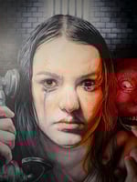 The telephone symbolises a call for help… a final tether to humanity before the demon fully takes over. Not only does it symbolise a broken connection, my aim was to actively place you as the viewer in the role of an inmate. The barrier created by the telephone reinforces the idea that rage-driven actions don’t just harm the person consumed by them but ripple outward, affecting those they care about. As the inmate, you can only listen—unable to reach through the glass, unable to undo the damage. This framing makes the girl’s expression even more haunting because she’s not just looking at the viewer; she’s looking at someone who has already succumbed to their worst impulses.