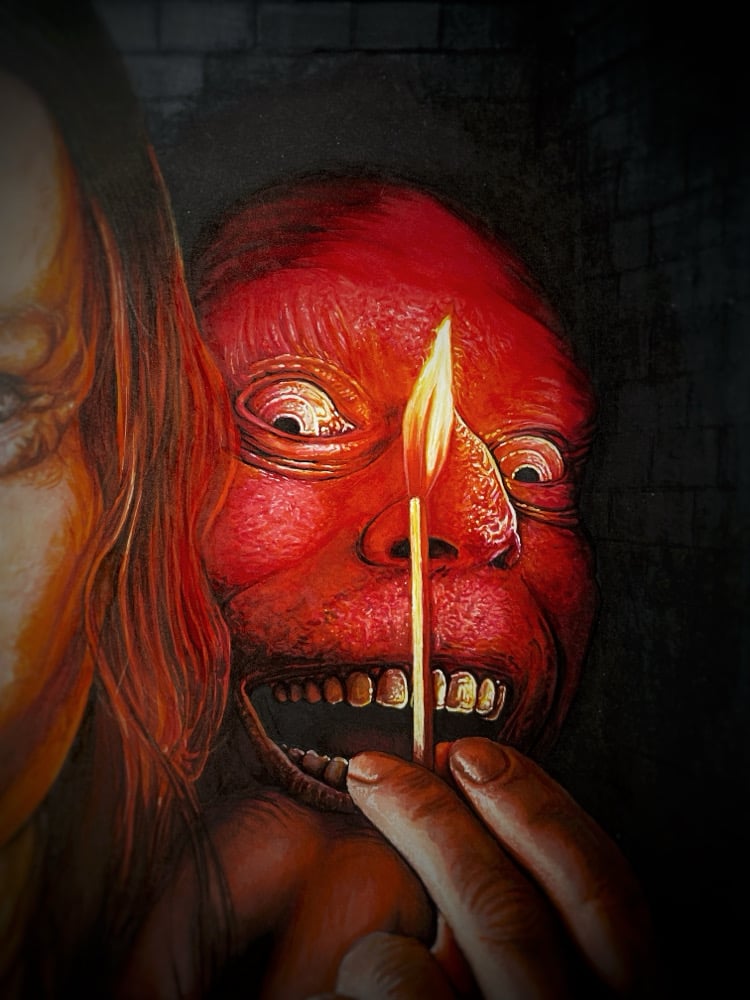 The fire from the match is both destruction and illumination. It can represent the moment of losing control—when anger ignites and dictates one’s actions—but it also highlights awareness. The fire exposes the demon, suggesting that acknowledging one’s rage can prevent it from fully consuming them. The contrast between the crying girl and the grinning demon further emphasizes the duality of human nature: the struggle between rationality and the temptation to give in to destructive emotions.