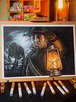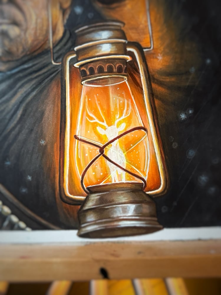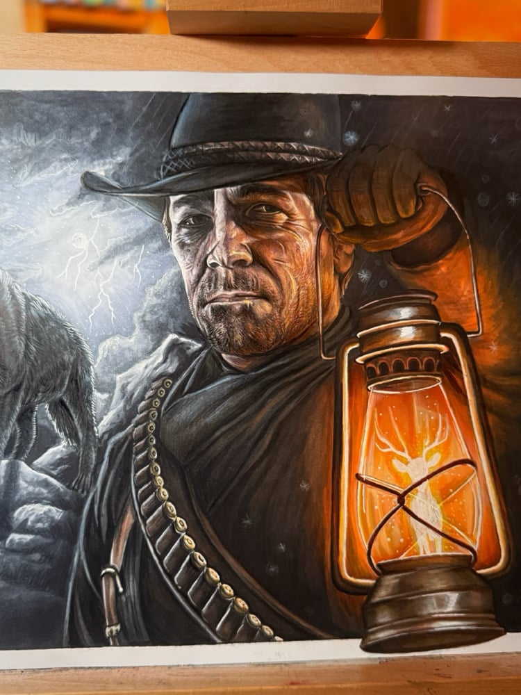 In the shadows behind him, the wolf prowls, a symbol of his past dishonor, of the violence and choices that once defined him. But in his grasp, a lantern glows with the image of an elk, the emblem of honor in the world of Red Dead Redemption. It’s a guiding light, fragile yet fierce, representing the man Arthur chooses to become.