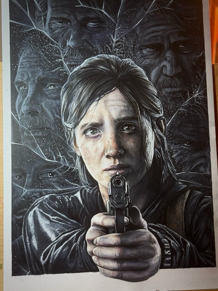 This artwork captures the essence of Ellie’s struggle, not just to survive in a broken world, but to survive herself. Her mind, like the world around her, is cracked and scarred, but it still holds fragments of beauty. Of love. Of humanity.