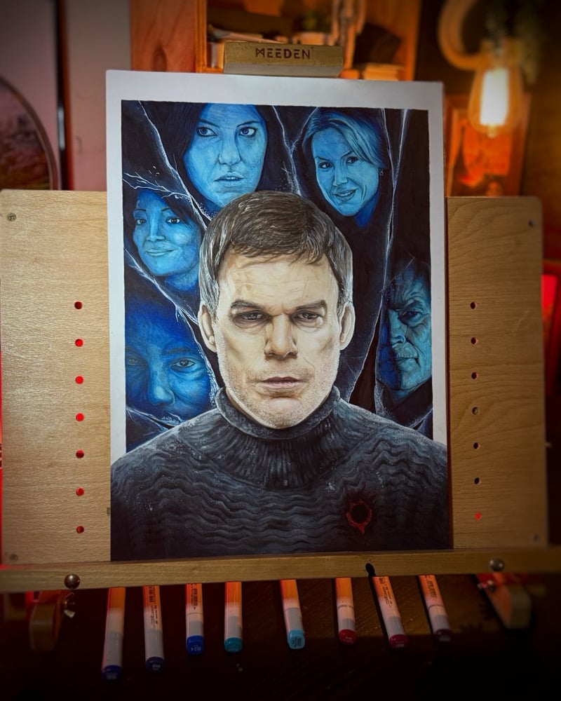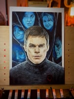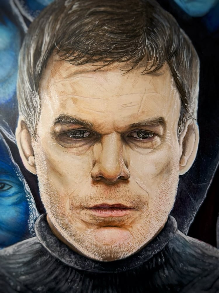 This artwork is a haunting reflection of Dexter Morgan’s most vulnerable moment—a reckoning. As his life flashes before his eyes, the web of shattered ice radiating from his gunshot wound mirrors the truth he can no longer outrun. Each fracture reflects an innocent life lost, each crack a consequence of the darkness he once thought he could control.
