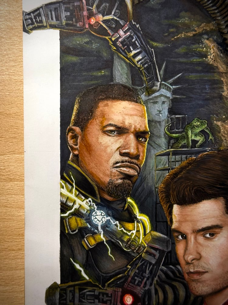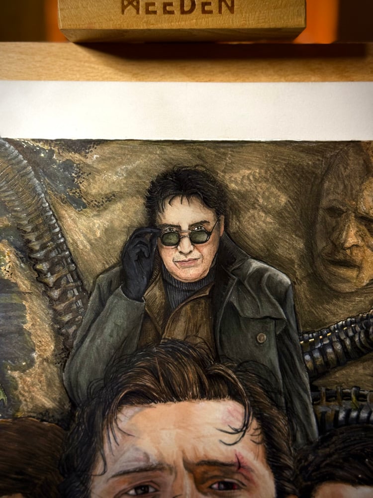 From the haunted stare of Tom Holland’s Peter, caught between sacrifice and duty, to the return of Andrew Garfield and Tobey Maguire—each brushstroke honors their pain, growth, and courage. Surrounding them, the villains loom like ghosts of the past: Doc Ock, Electro, Sandman, Lizard, and the menacing Green Goblin—all rendered in gritty detail and vivid color.